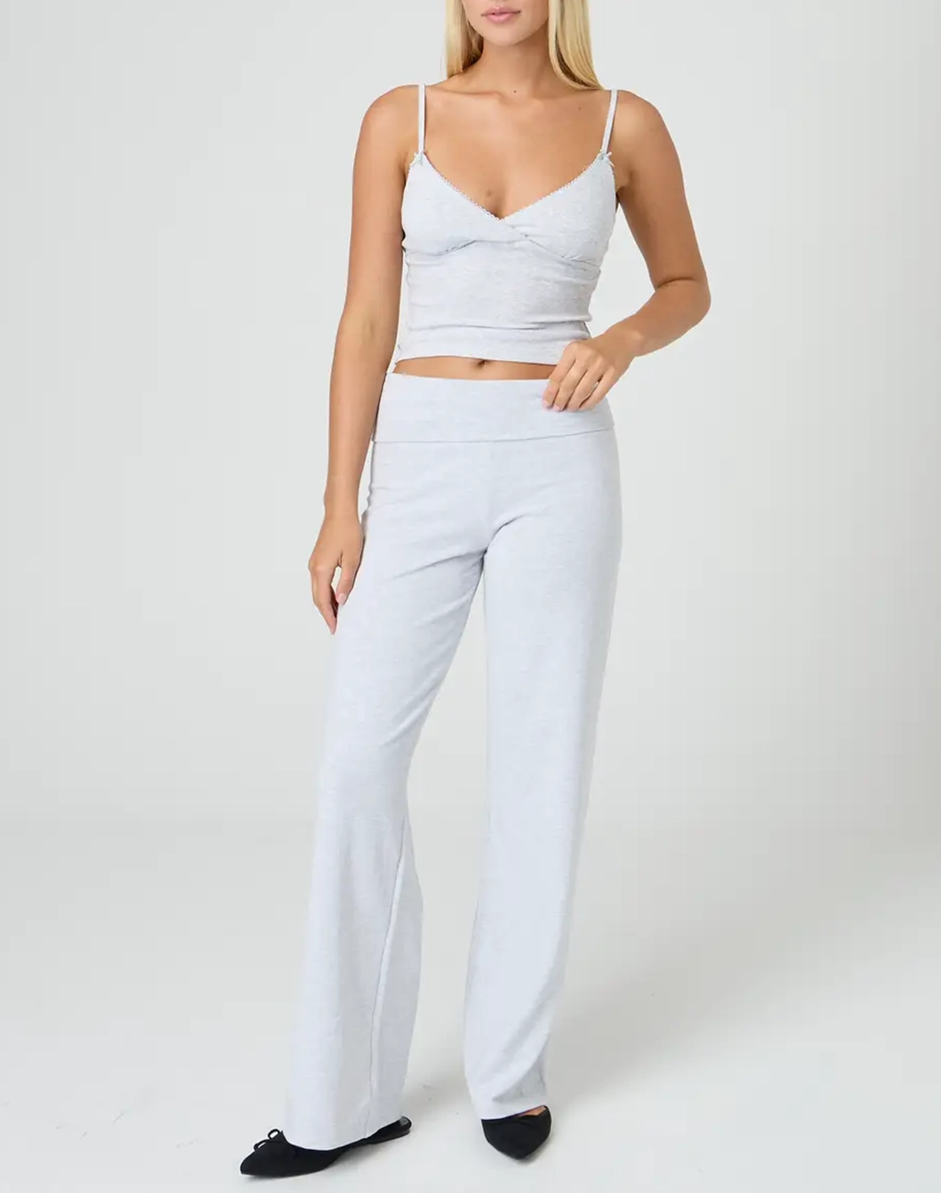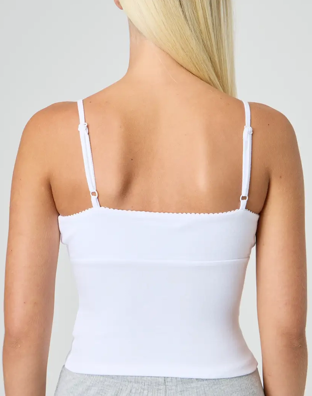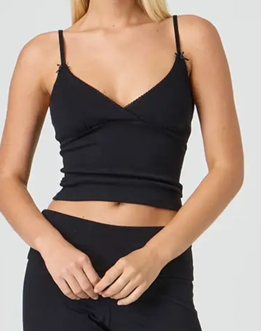 This cami top features a crossover front, picot trim, adjustable straps and a full length.