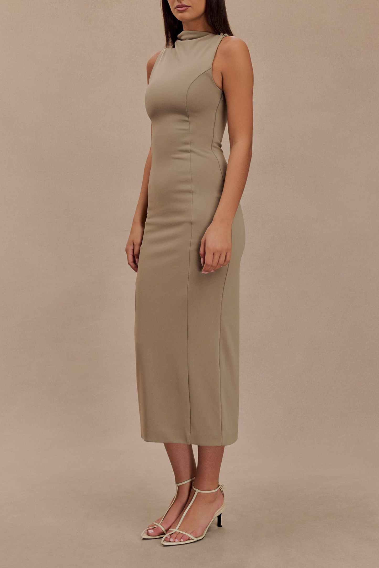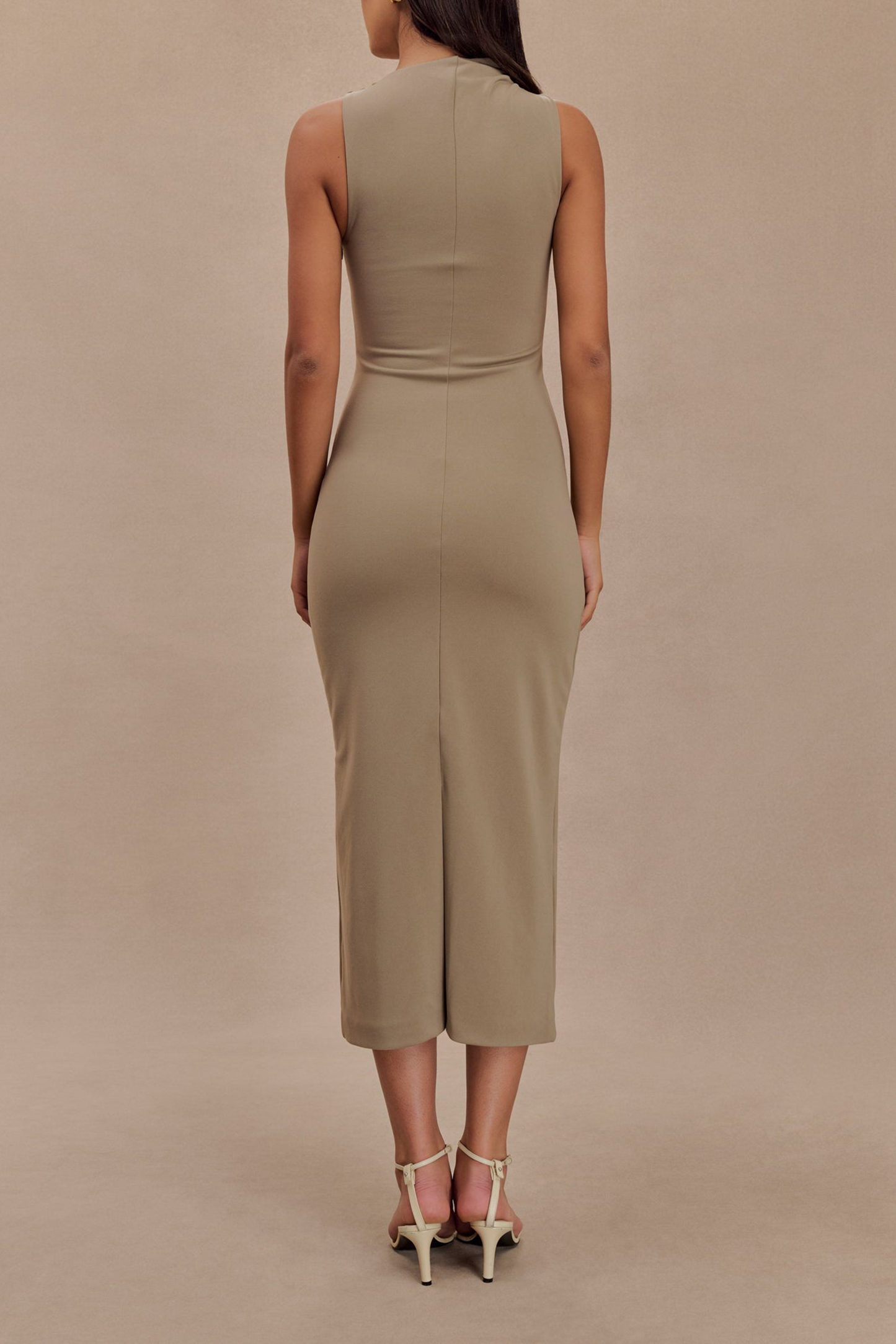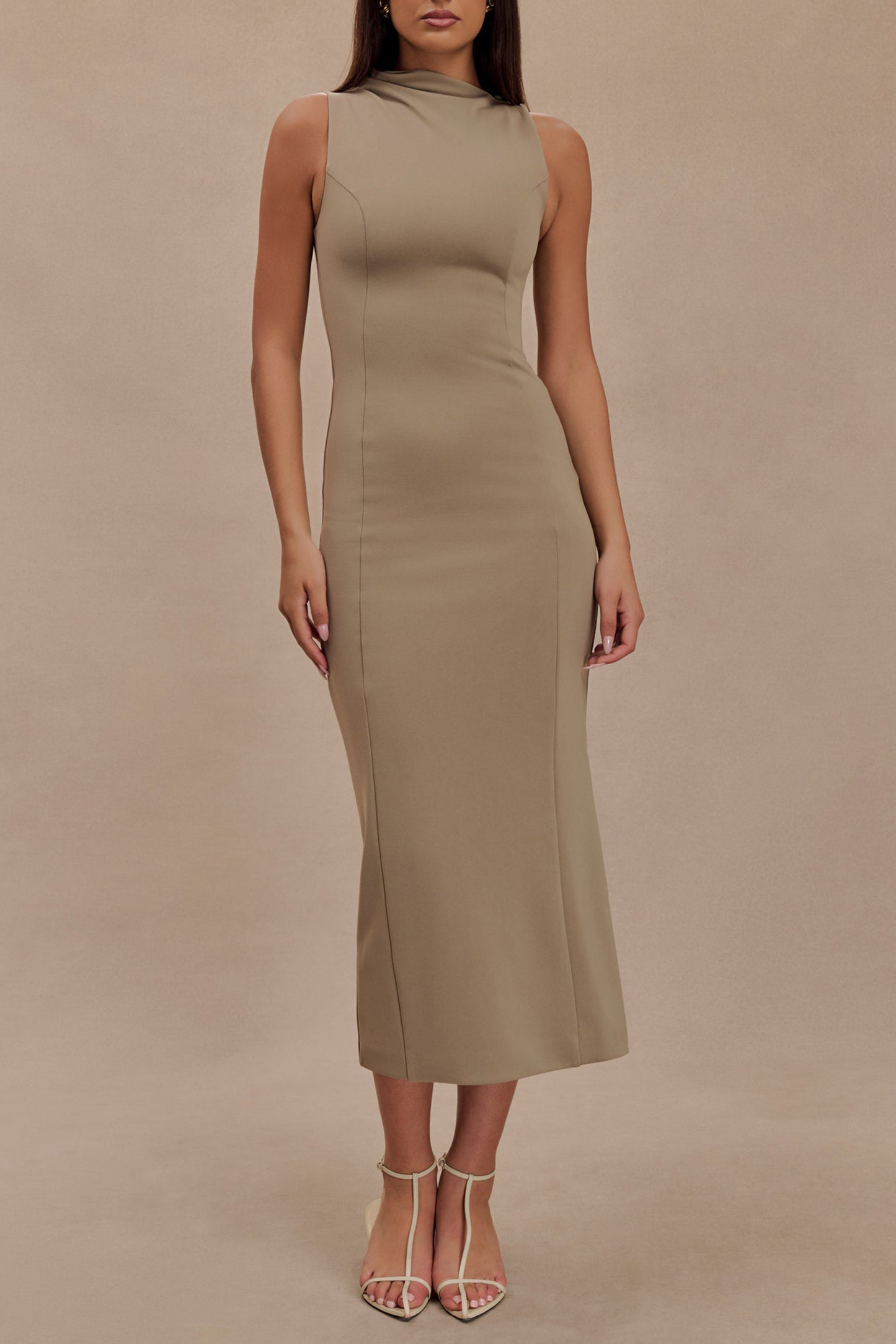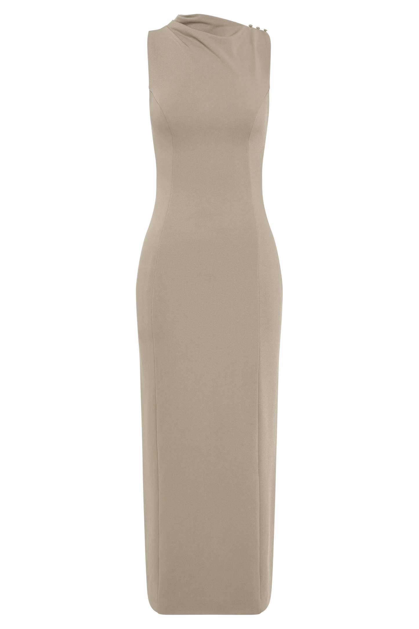 The Draped Crepe Maxi Dress is a stunning fusion of elegance and modern design. Its asymmetrical gathered neckline adds a unique and sophisticated touch, while the fitted bodice enhances your silhouette with its flattering panel detailing. The midi length and straight skirt create a sleek, streamlined look, perfect for both formal and semi-formal occasions. A side zip ensures a smooth fit, and the centre back vent allows for ease of movement. The Dress combines refined style with contemporary details, making it a standout choice for any special event.