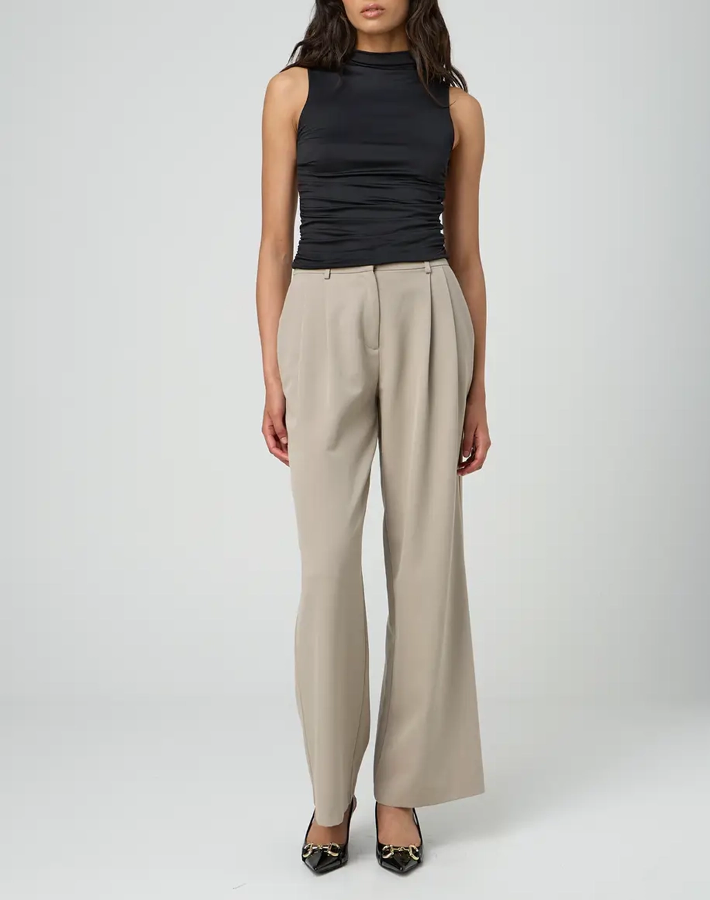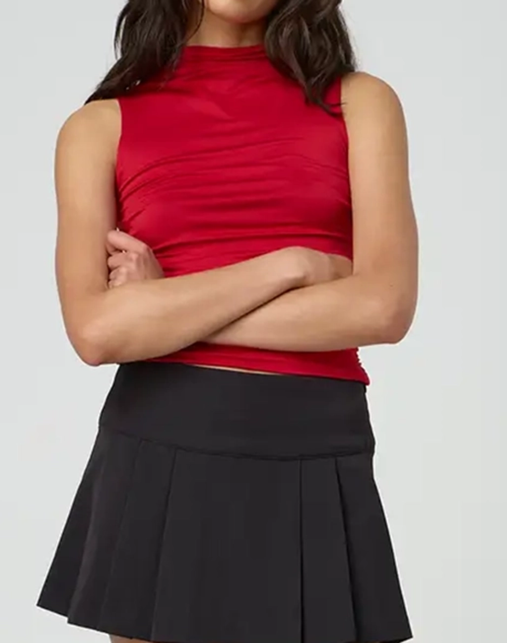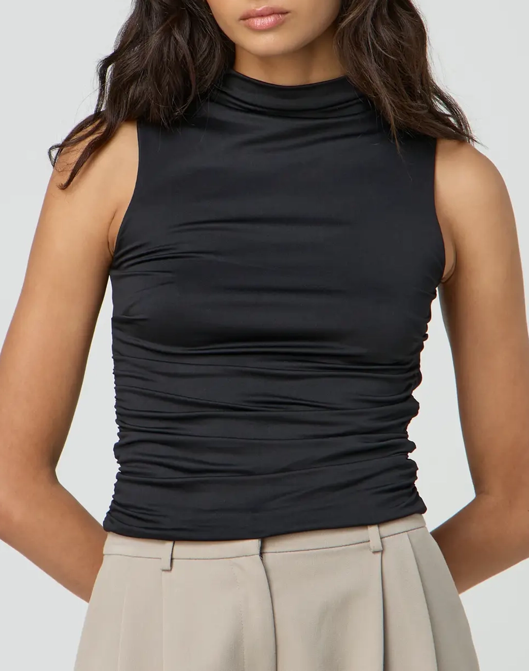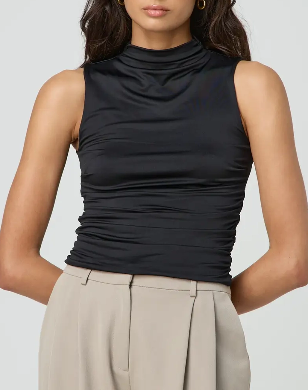 This sleeveless top features a high neckline, an open back and side ruching.