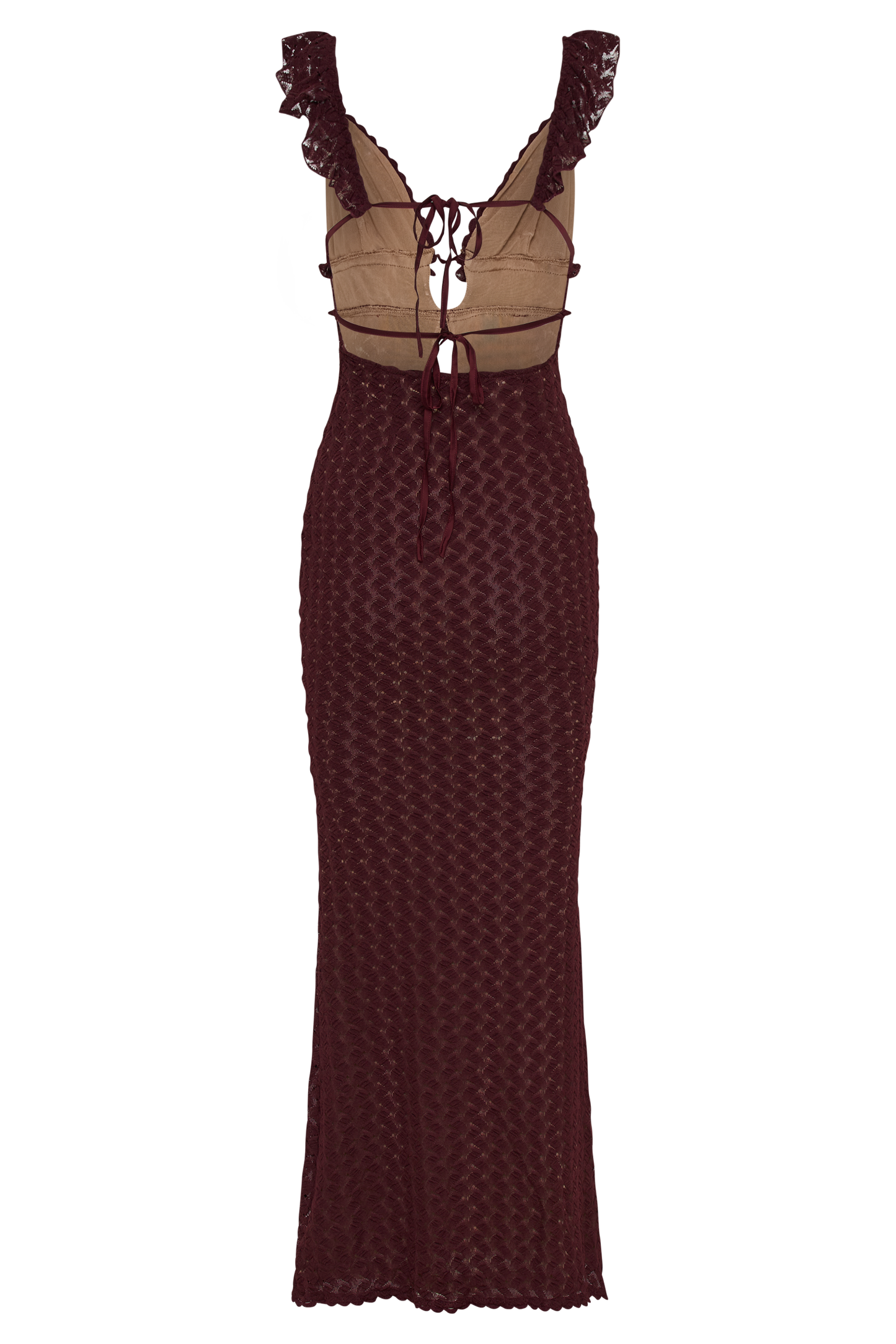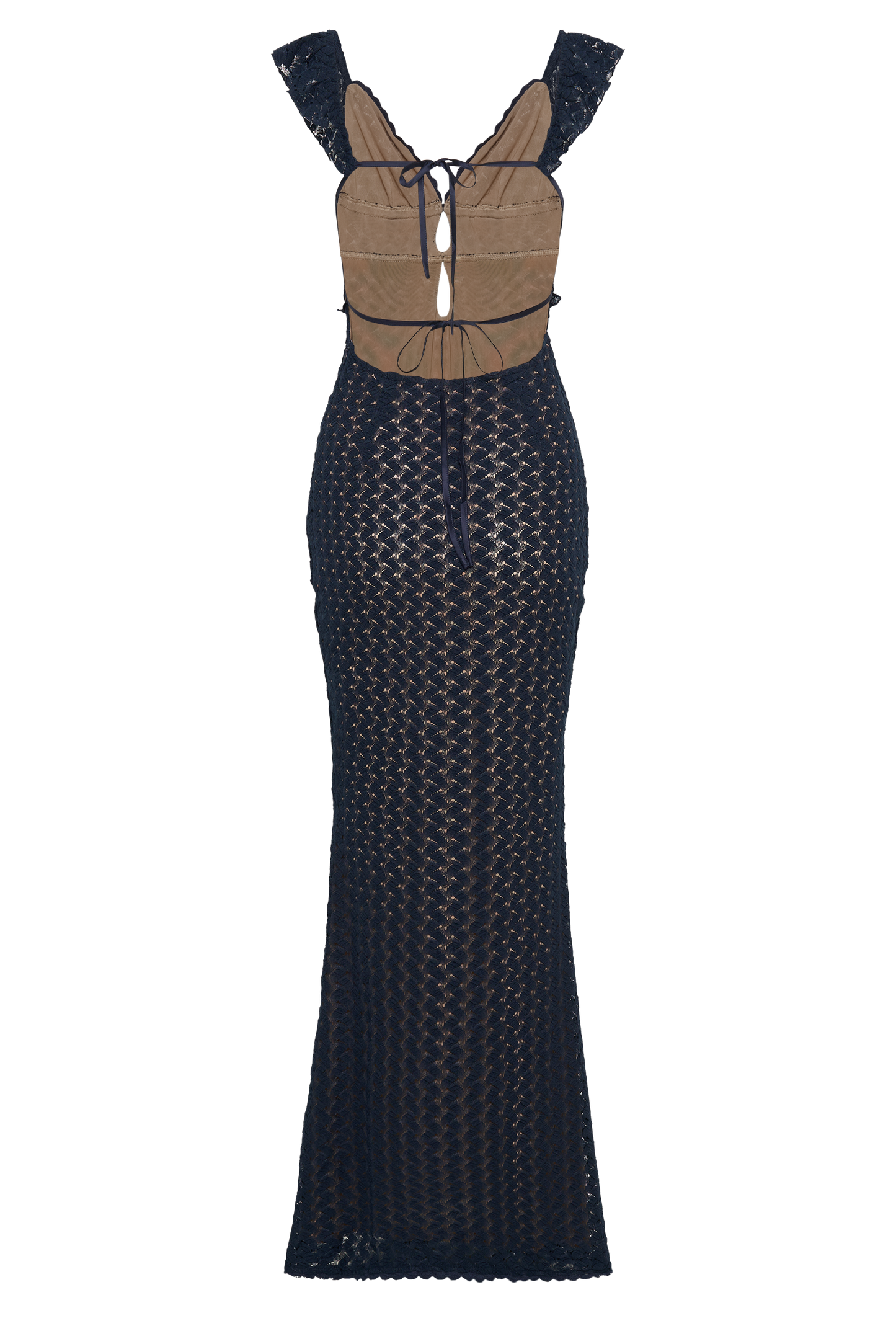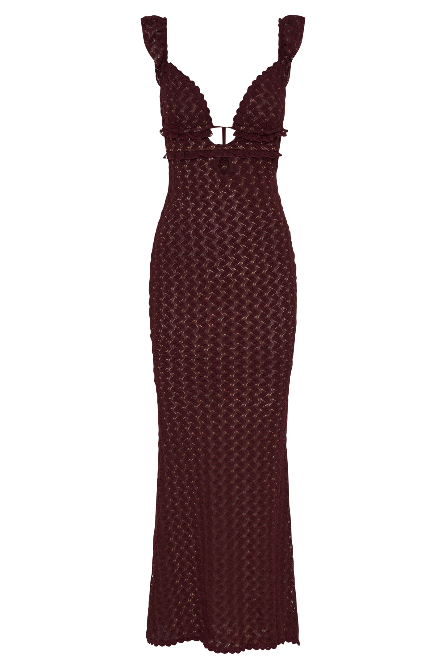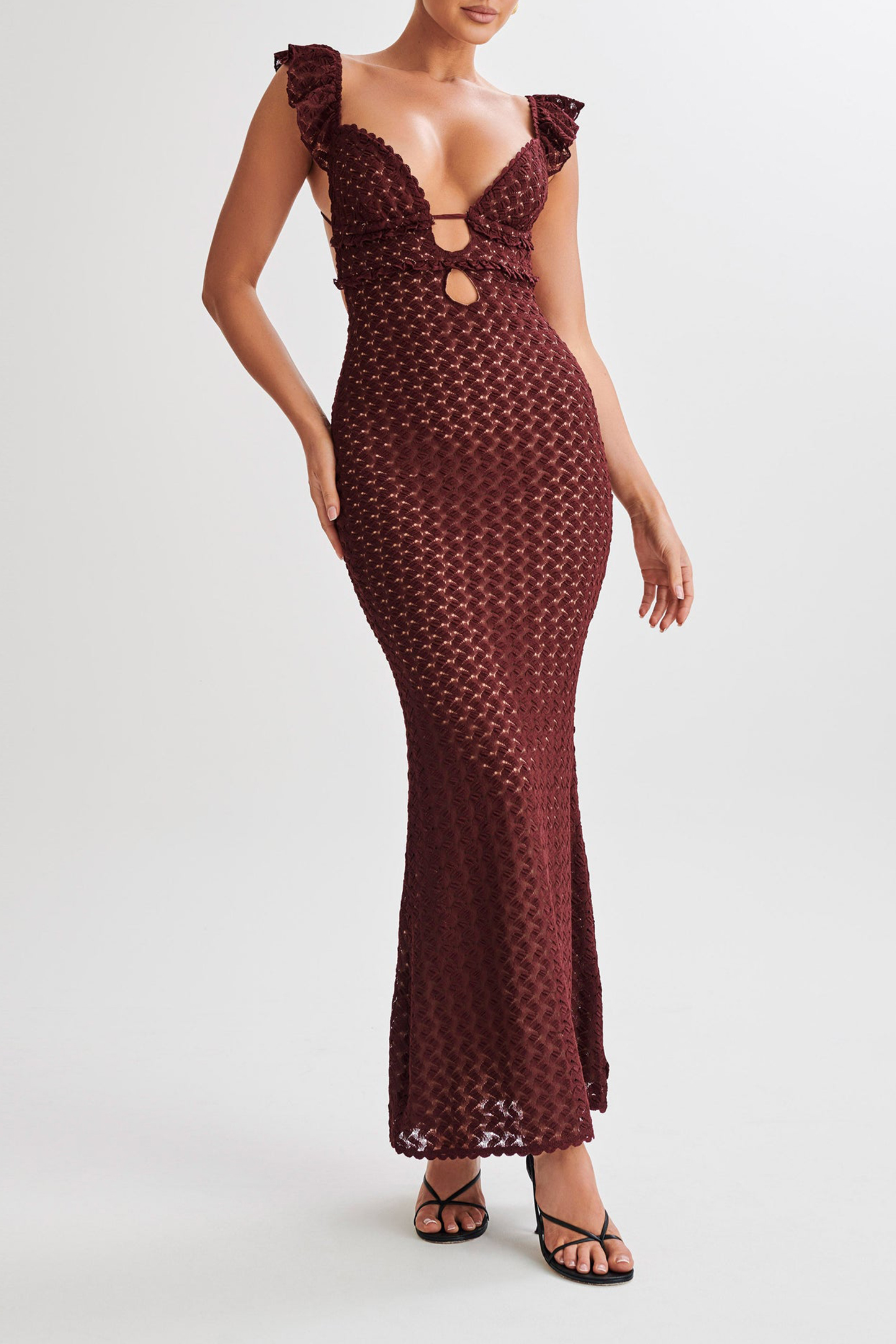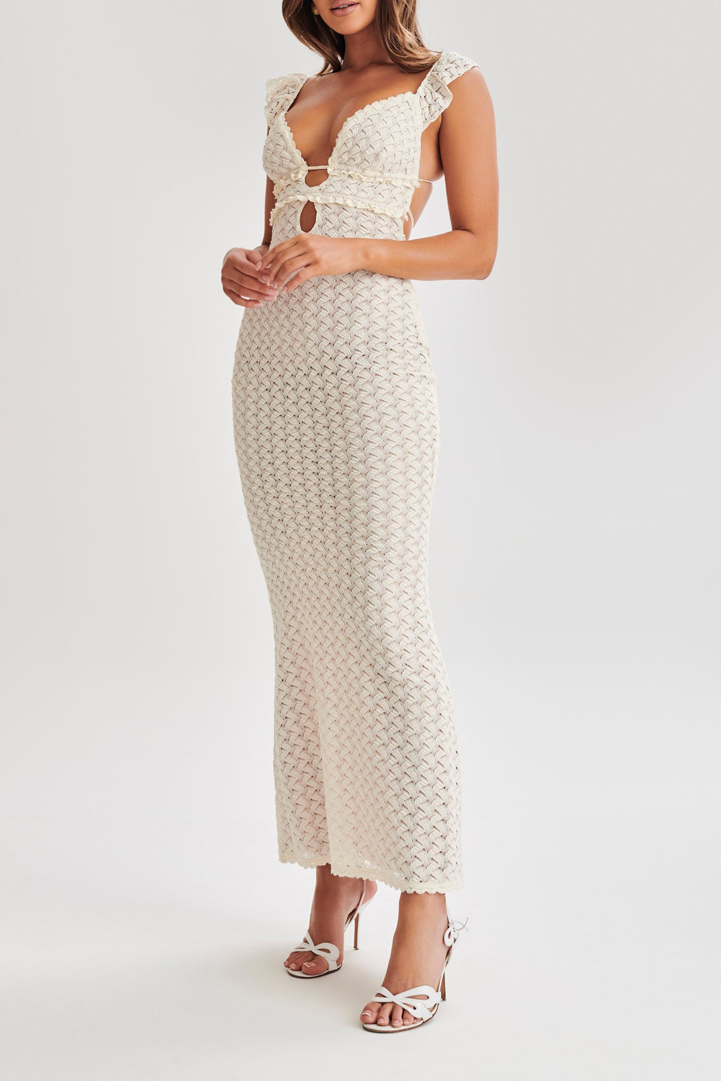 Indulge in the chic allure of the Knit Maxi Dress, a captivating piece that effortlessly blends comfort and style. The V neckline and flutter sleeves add a touch of femininity, creating a flattering silhouette. Self-ties at the back allow for a personalised fit, while the centre front keyhole adds a hint of intrigue. The dress boasts a patterned knit that exudes modern charm, and being unlined knitwear, it provides a breathable and relaxed feel. Elevate your fashion game with, a versatile maxi dress that embodies casual elegance and makes a bold statement with its unique design elements.