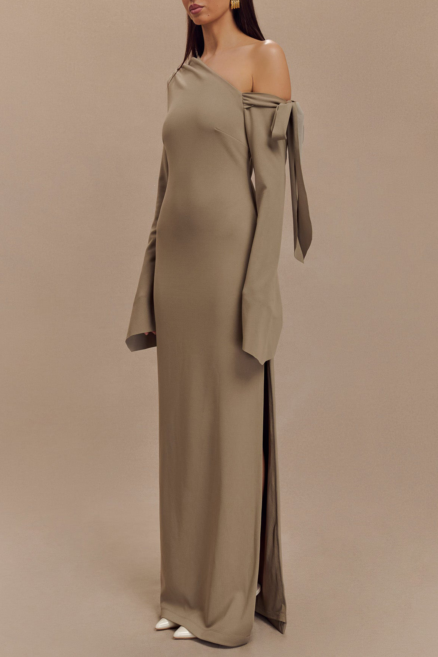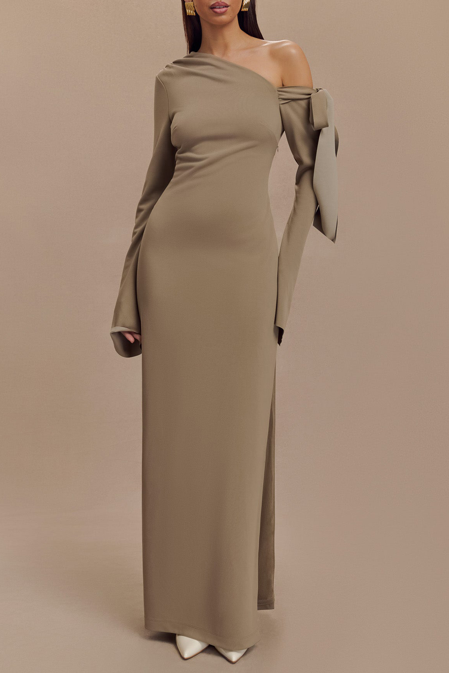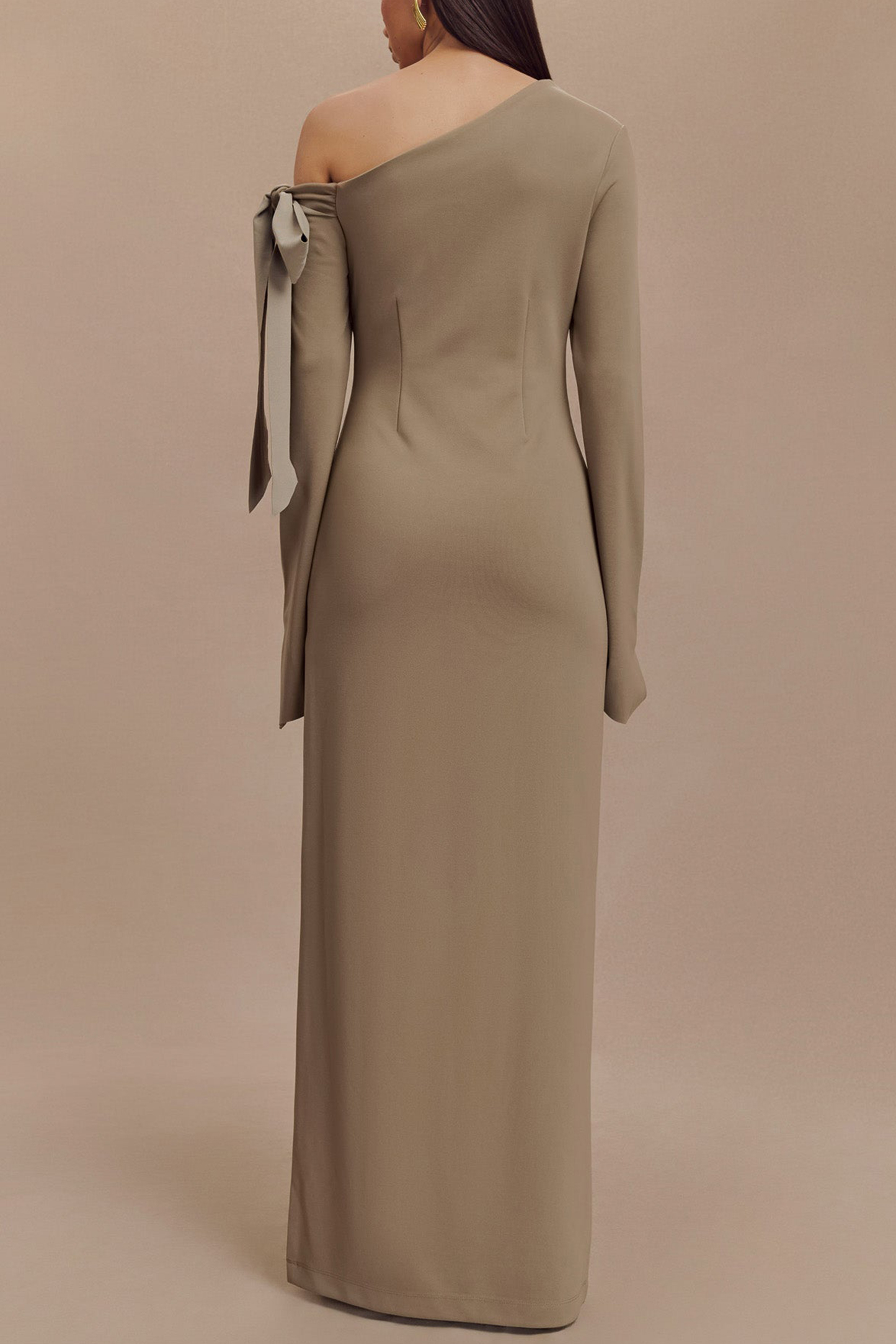 The One Shoulder Crepe Maxi Dress is a stunning blend of modern elegance and timeless sophistication. Featuring an asymmetrical neckline with a chic open shoulder and ruched detailing, this dress exudes contemporary glamour. The ruching at the waist enhances the silhouette, creating a flattering, body-skimming effect. With a functional tie at the shoulder for adjustable styling, a side zip for a smooth fit, and stretch fabrication for added comfort, the Dress ensures a perfect blend of form and function. The long sleeve and fully lined design provide both coverage and a refined finish, making this maxi dress ideal for any formal or special occasion.