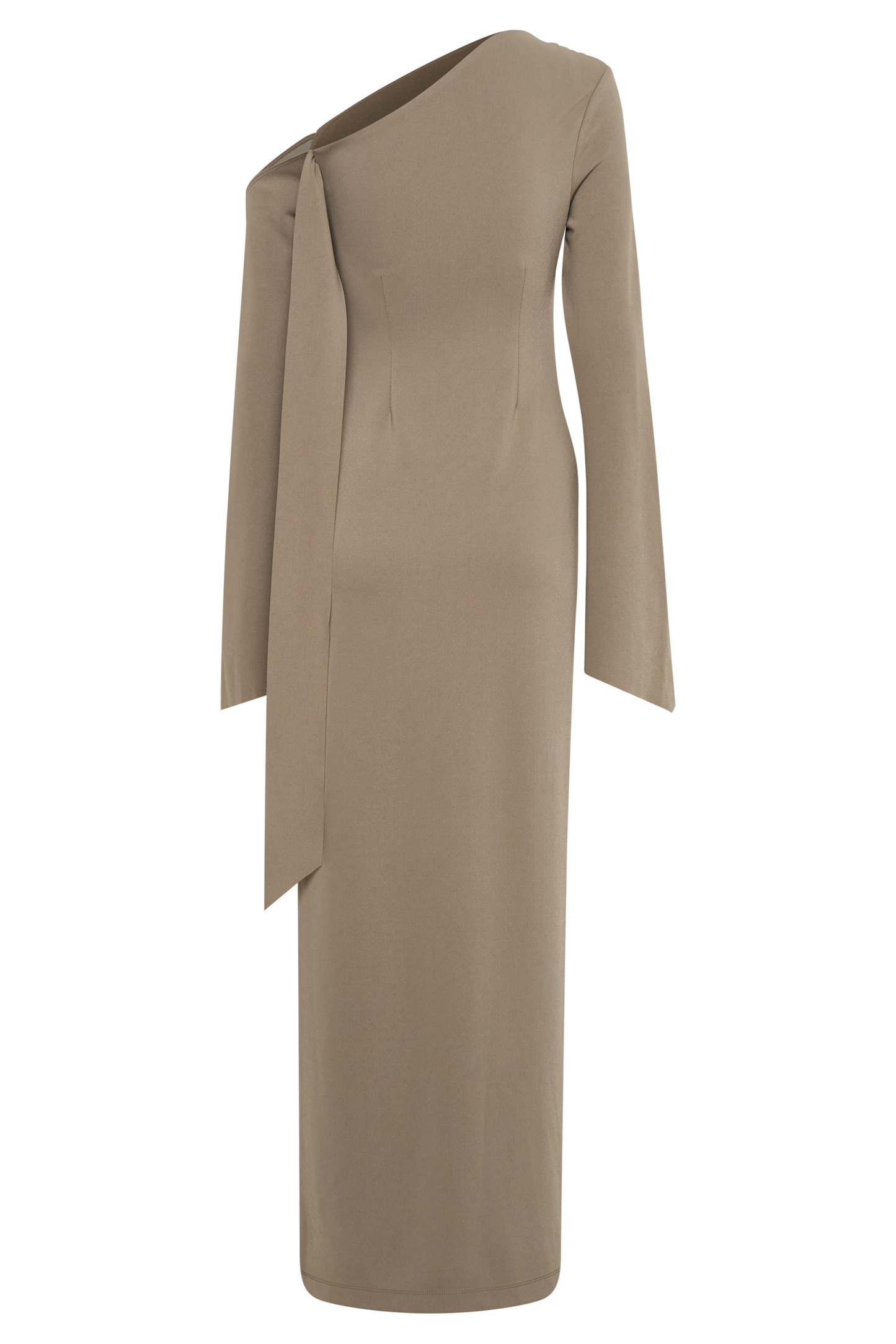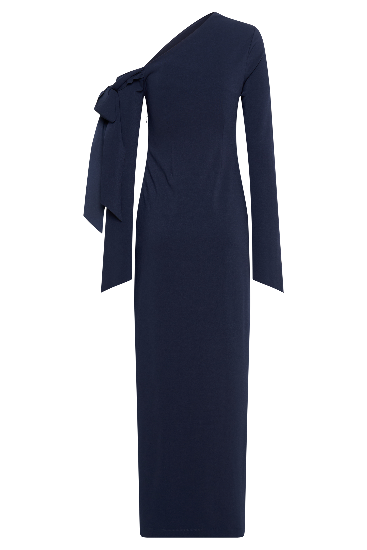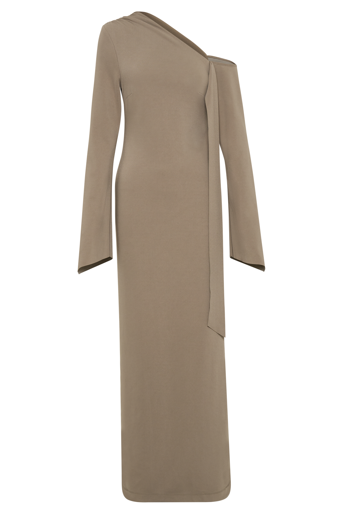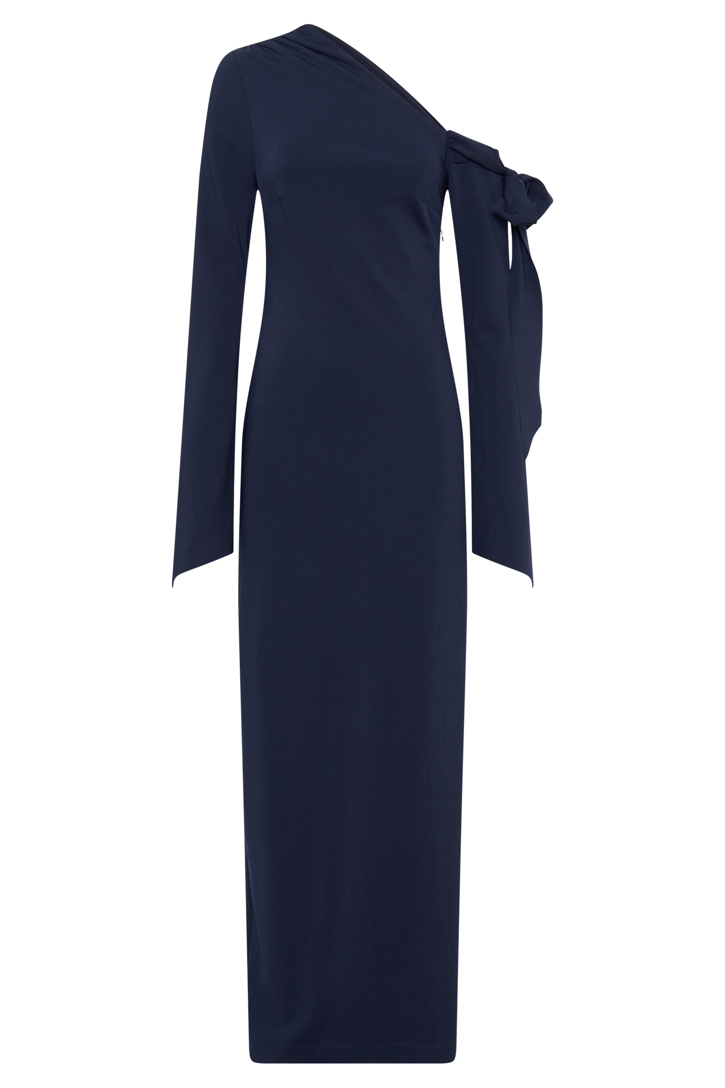 The One Shoulder Crepe Maxi Dress is a stunning blend of modern elegance and timeless sophistication. Featuring an asymmetrical neckline with a chic open shoulder and ruched detailing, this dress exudes contemporary glamour. The ruching at the waist enhances the silhouette, creating a flattering, body-skimming effect. With a functional tie at the shoulder for adjustable styling, a side zip for a smooth fit, and stretch fabrication for added comfort, the Dress ensures a perfect blend of form and function. The long sleeve and fully lined design provide both coverage and a refined finish, making this maxi dress ideal for any formal or special occasion.