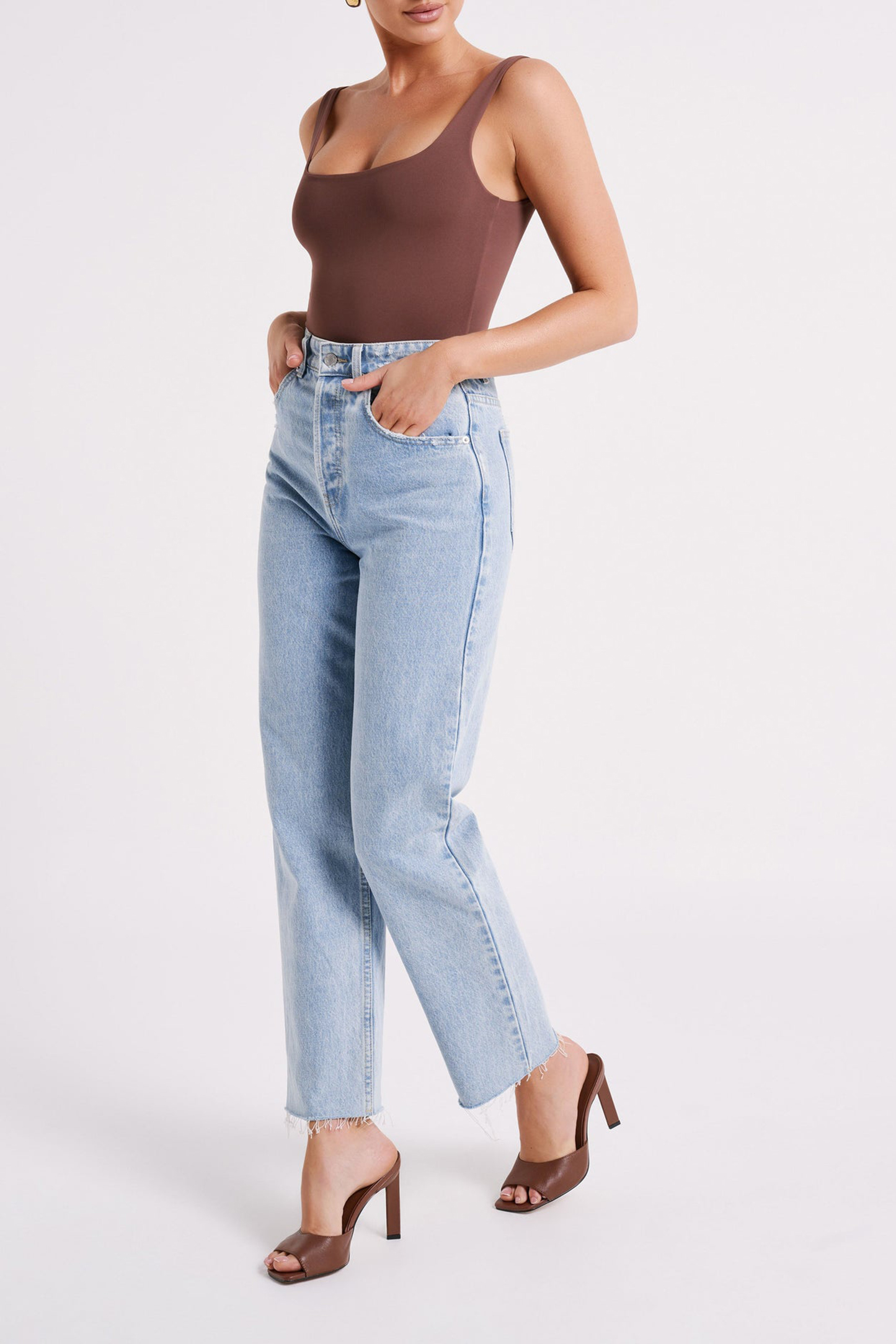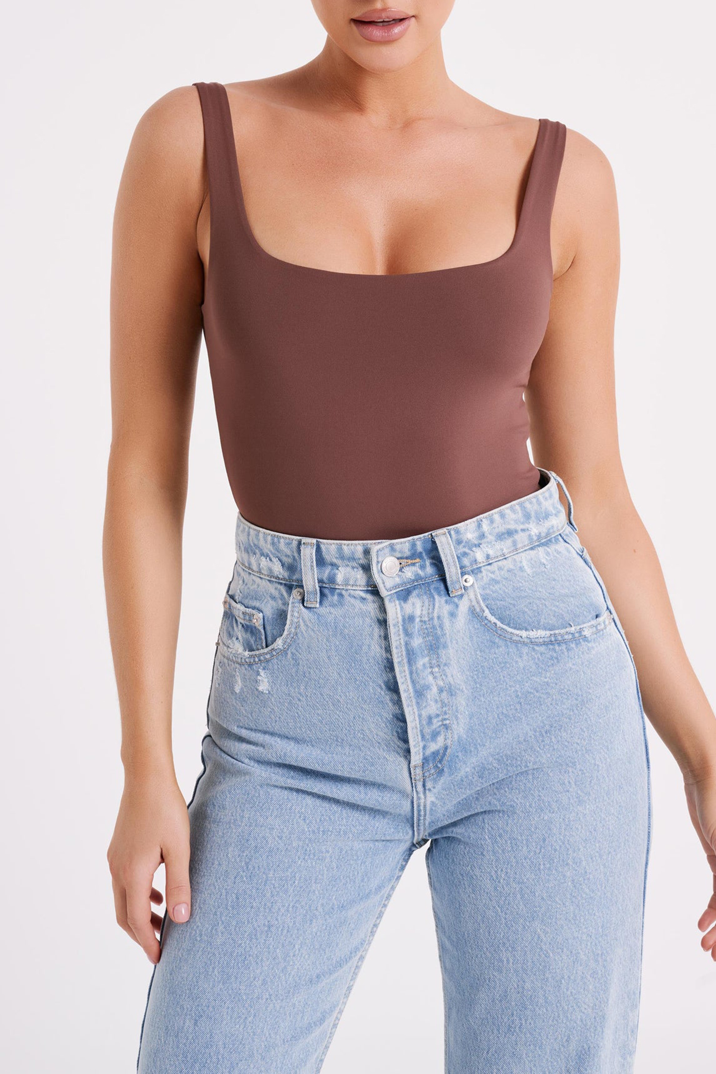 This is a sleeveless bodysuit with a cheeky, high leg cut and low scooped neckline. Sleek and seamless, this bodysuit offers a classic cut with clean, feminine edges that suits both casual and workwear fits. Fairly wide shoulder straps and a low back beautifully frame the neck and shoulders area while the stretchy, elastic fabrication clings to curves in a naturally flattering way.