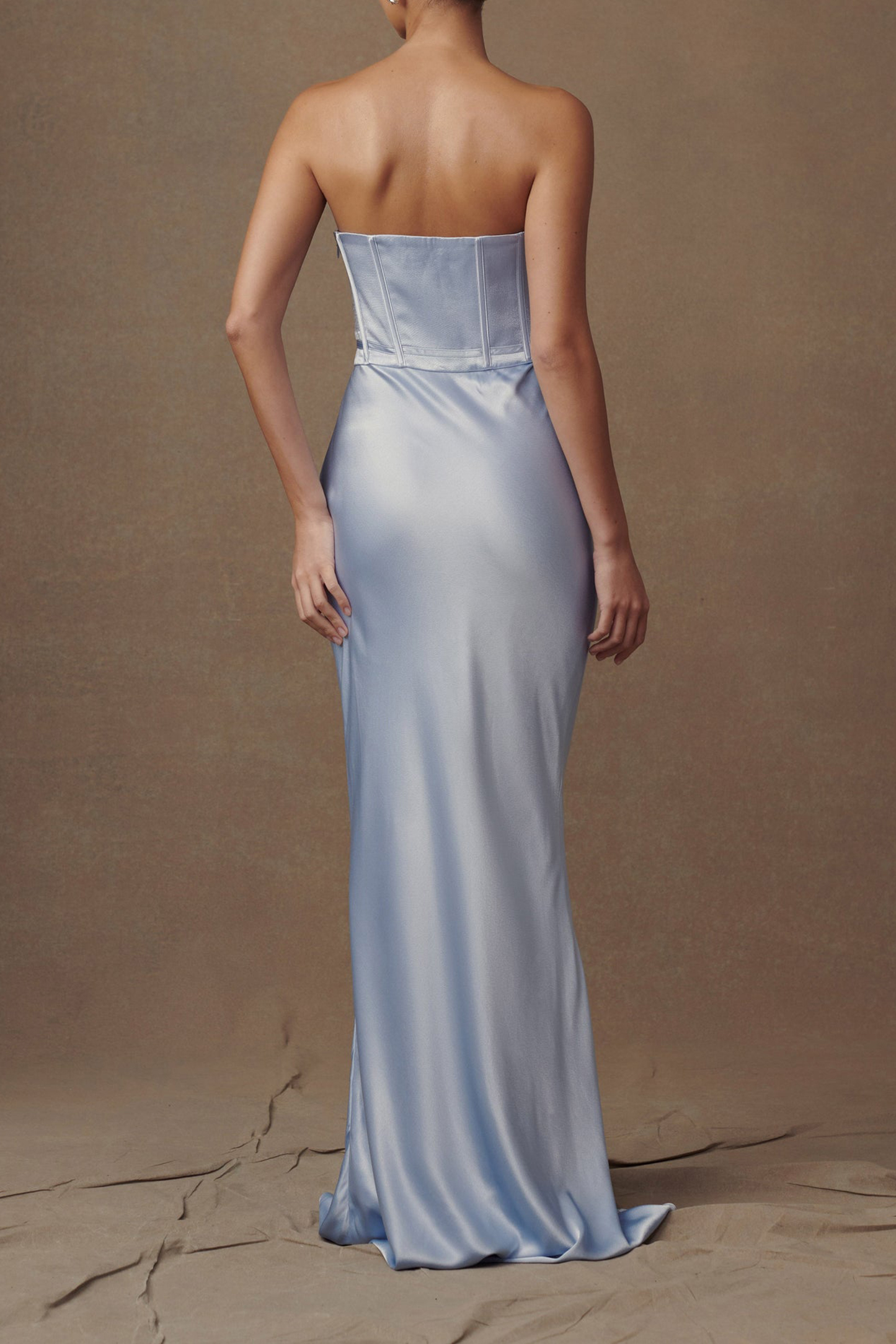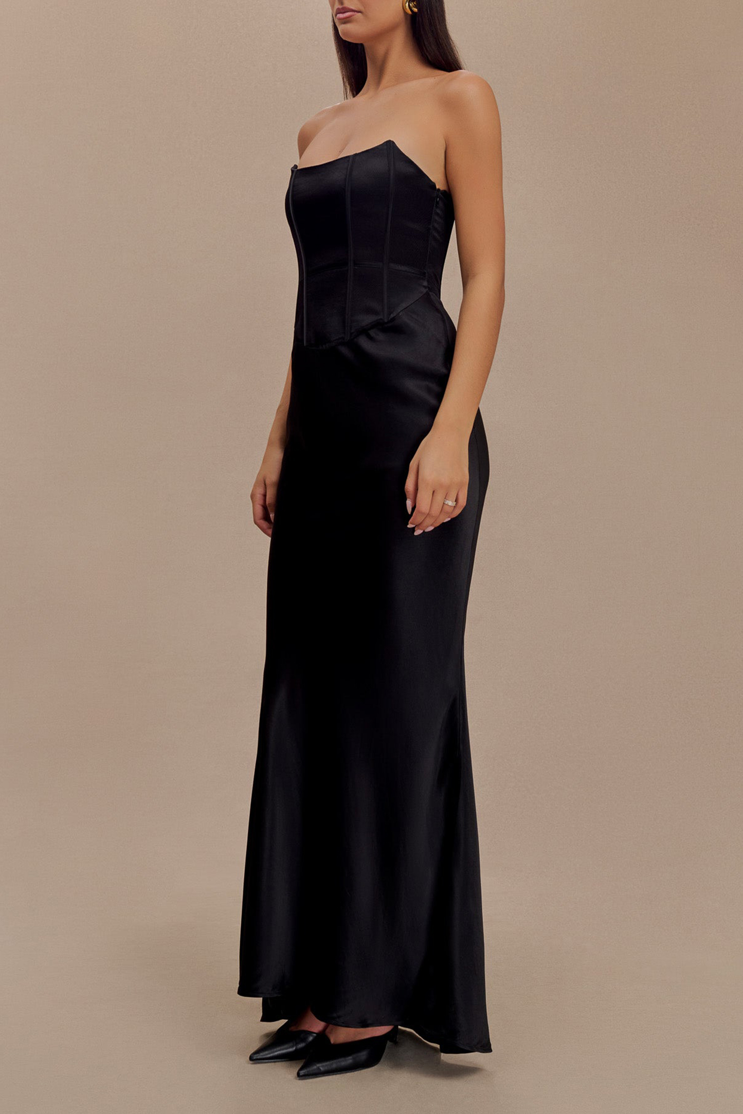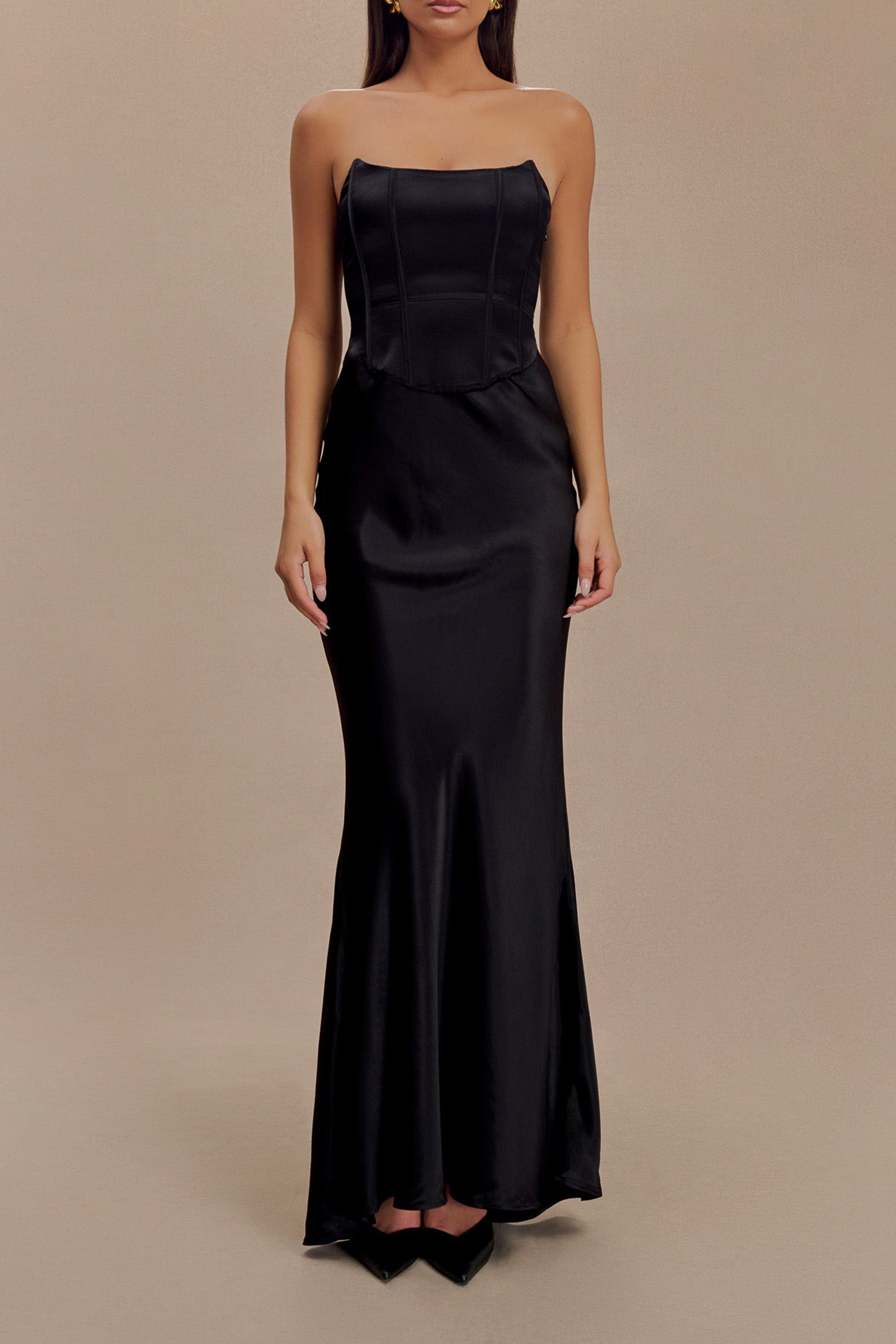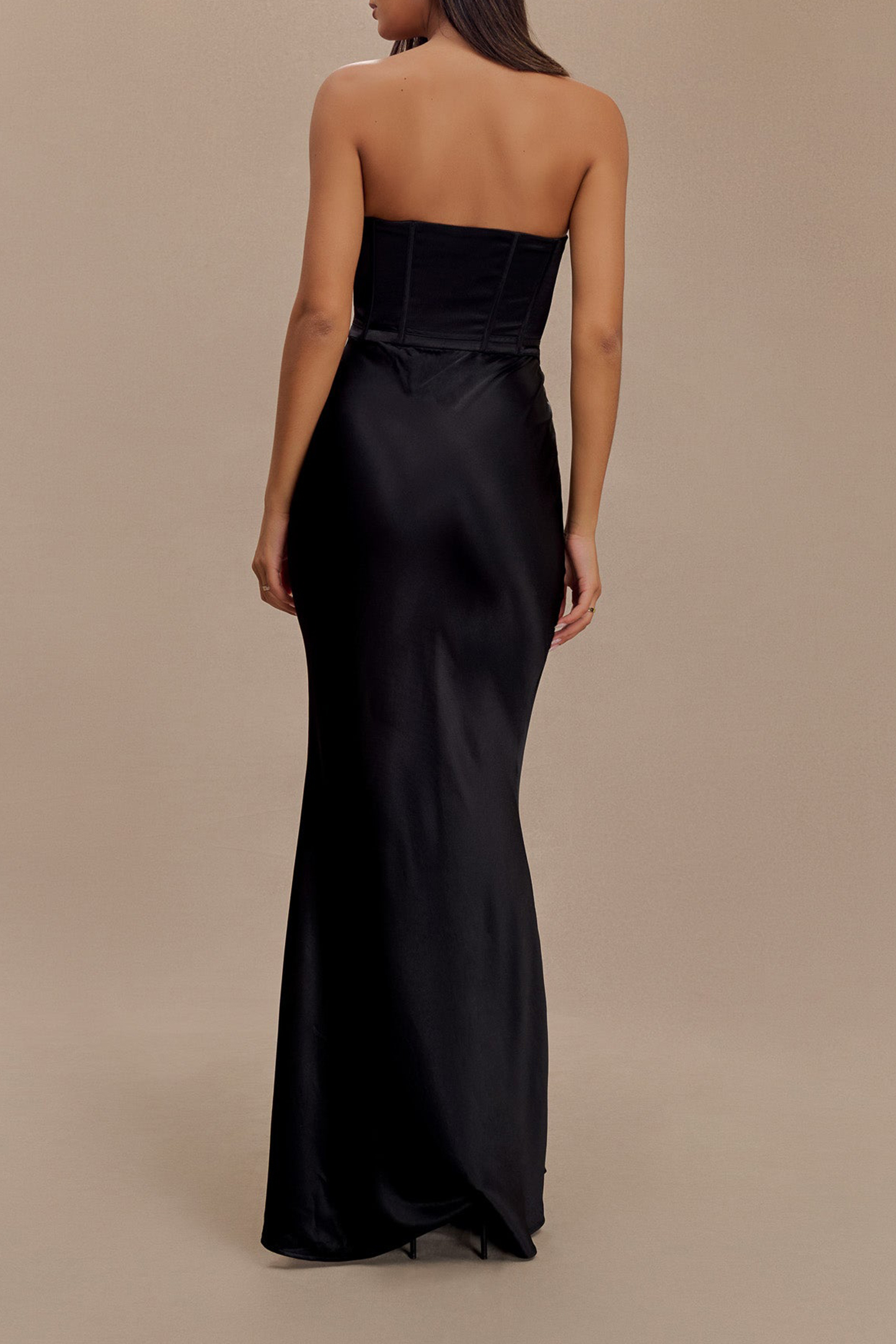 Elevate your evening look with the Satin Strapless Maxi Dress, a captivating blend of sophistication and allure. Featuring a strapless silhouette and a structured, boned bodice, this dress ensures a flattering fit with a touch of vintage-inspired charm. The corset detailed bodice adds a unique flair, while the bodycon style accentuates your curves beautifully. Crafted from luxurious satin fabrication, it exudes elegance and glamour. With its flowing maxi length, the dress is your go-to choice for making a statement at any special occasion.