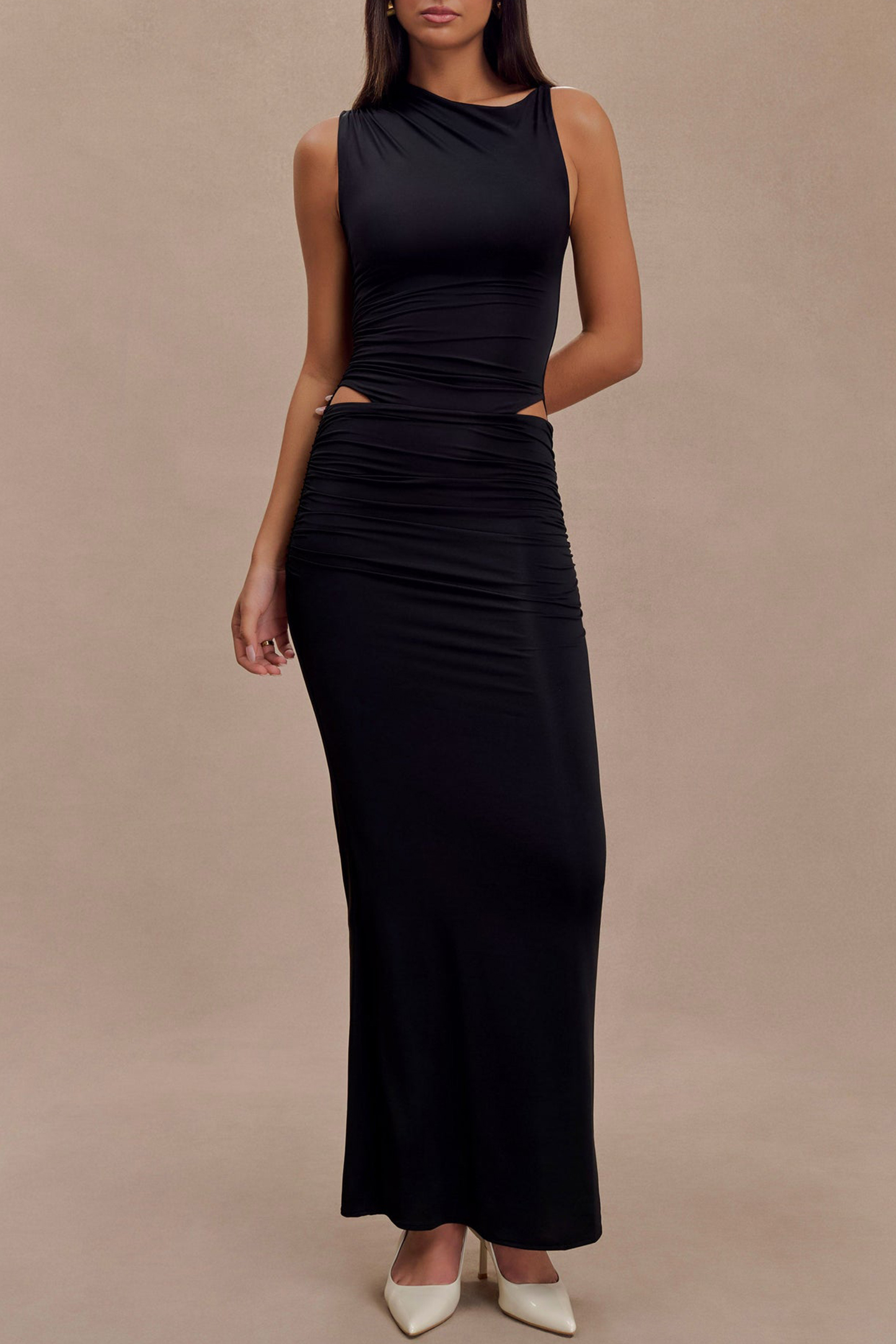The Slinky Cut Out Maxi Dress combines sleek design with statement details. Featuring an asymmetrical neckline with elegant ruching, this bodycon dress sculpts the silhouette while the cutout details at the hips add a daring touch. The ruching at the waist enhances the shape, and the maxi length exudes timeless allure. Fully lined for comfort and a flawless fit, the Dress is the ultimate blend of modern glamour and refined elegance.